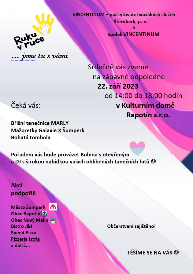 Dne 22. 9. 2023 proběhne v Kulturním domě Rapotín s.r.o. již pátý ročník společenského odpoledne pro osoby se zdravotním postižením a jejich rodiny ze Šumperka a okolí s názvem